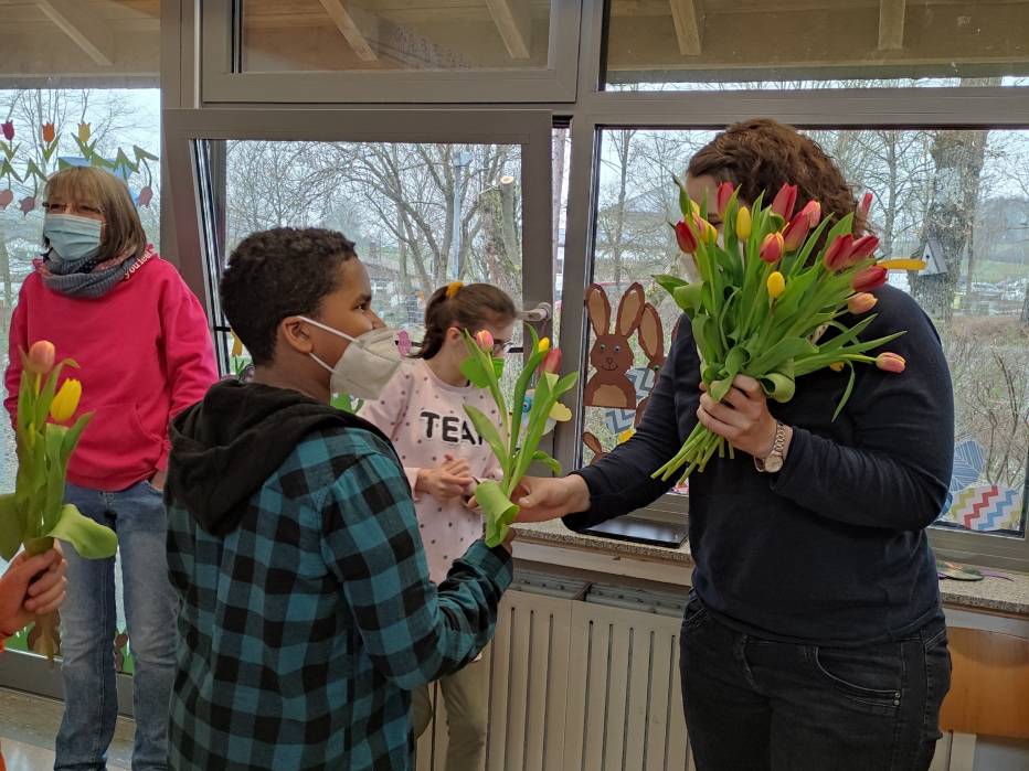 Frau Bock wurde heute in "ihren" Klassen verabschiedet und bekam einige Geschenke und Aufmerksamkeiten, die sie an die vergangenen Jahre mit vielen Aktivitäten und Ausflüge erinnern sollen. Natürlich durften da Blumen bei der Verabschiedung nicht fehlen.