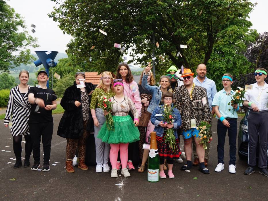 Endlich war es soweit: Der letzte Schultag für die Entlassschülerinnen und Entlasschüler! Mit einer grandiosen Vorstellung verabschiedeten sich die Abschlussschülerinnen und Abschlussschüler von der Schulgemeinde. Besonders bei der Überreichung der Geschenke von den anderen Klassen flossen einige Tränen. Frau Stratenschulte und Herr Besting fanden treffende Worte für jede einzelne Schülerin und jeden einzelnen Schüler bei der anschließenden Zeugnisübergabe. Ein Gläschen Sekt rundete den perfekten Tag ab!